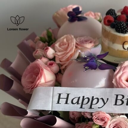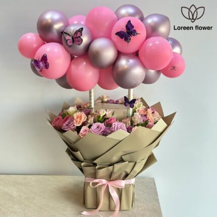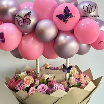 تتميز هذه الباقة الفاخرة بتنسيق ساحر يجمع بين الألوان الزاهية واللمسات العصرية. تتضمن قوسًا من البالونات الجميلة بعرض 80 سم،