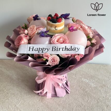 باقة ورد لعيد الميلاد تتميز هذه الباقة بتركيبة فريدة تجمع بين الزهور الوردية الرقيقة والبالونات الناعمة، مع لمسة خاصة من