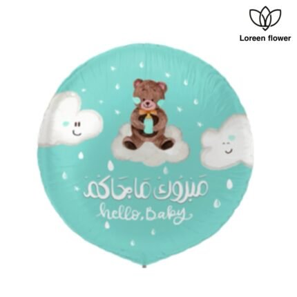 بالون قصدير للمواليد بلون مميز وتصميم جذاب. يظهر دبدوب صغير يحمل زجاجة حليب، جالسًا على سحابة مع بعض القطرات الجميلة.