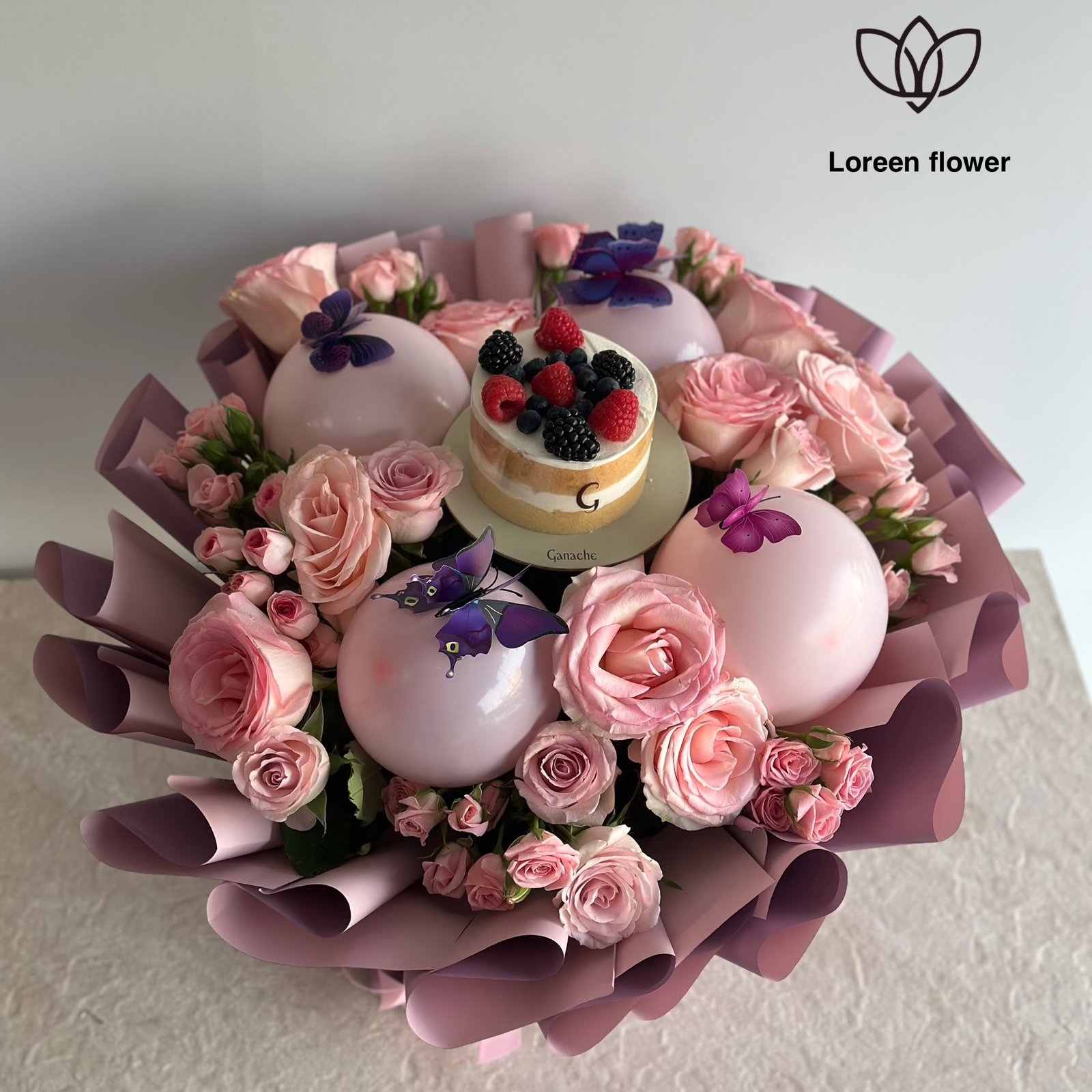 تجمع هذه الباقة بين أزهار الورد الوردي الرقيقة والأنيقة، مع لمسات من الفخامة بفضل كعكة جاناش لشخصين مزينة بالفواكه الطازجة مثل التوت والرازبيري. هذه الباقة تضم أيضًا بالونات زهرية ضخمة تضفي لمسة مرحة وملونة، بجانب الفراشات الزاهية التي تزين الورود بشكل جميل. تم اختيار تغليفها الوردي اللامع مع طيات ناعمة ليعكس أناقة فريدة من نوعها.