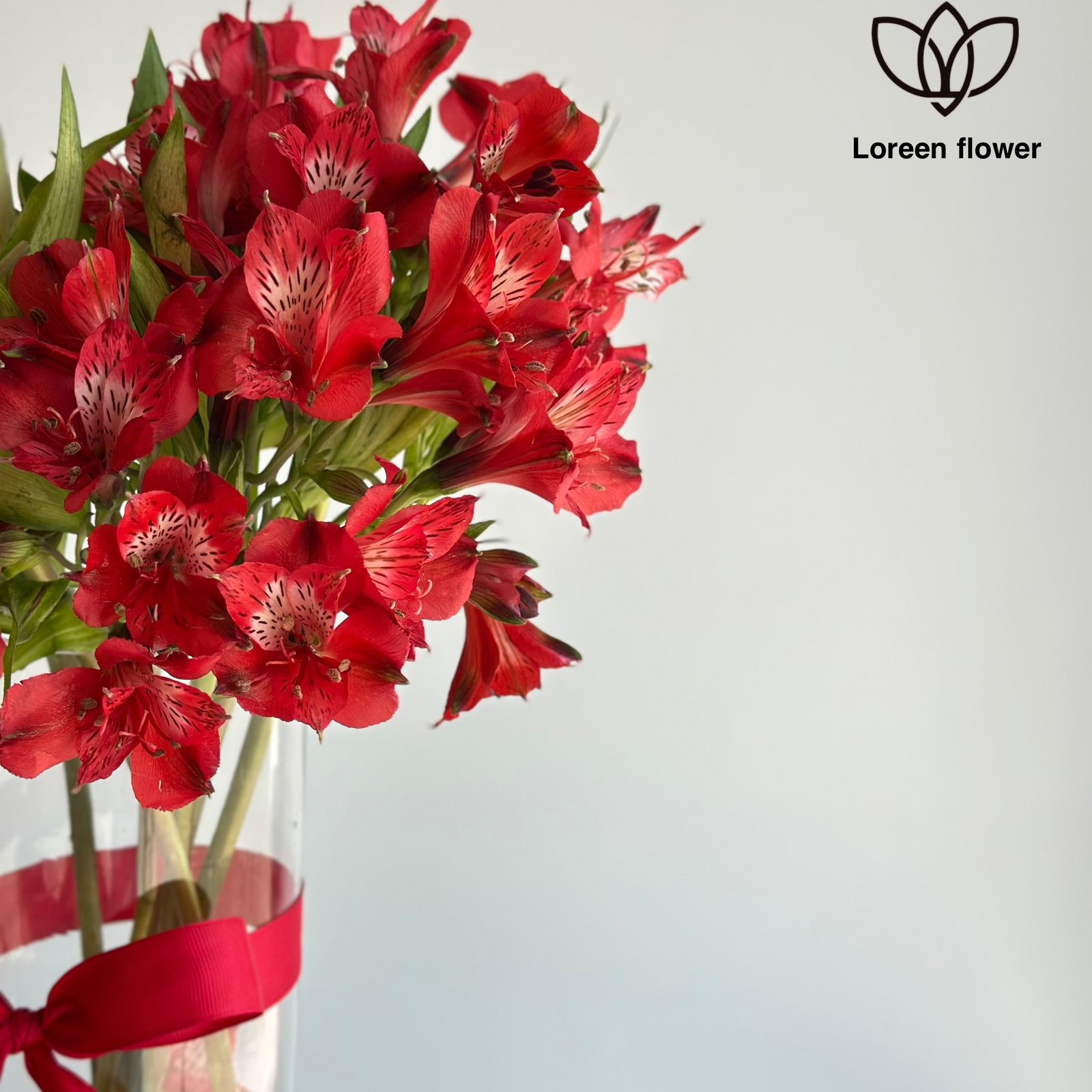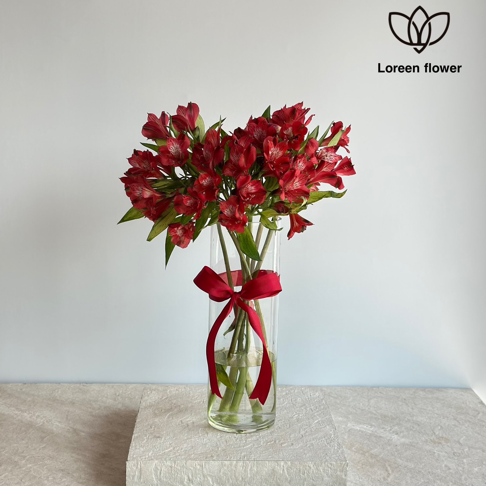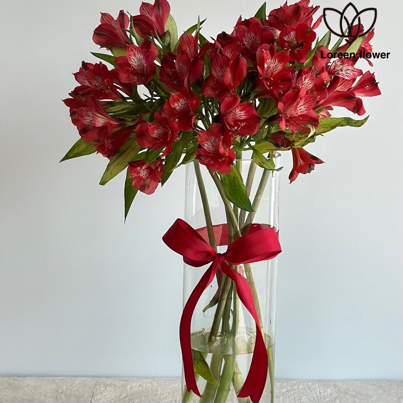 باقة ورد ساحرة تضم 14 غصن من استوميرا حمراء، حيث تبرز الأزهار الحمراء الجميلة بشكل أنيق ومثير. تم تزيين الباقة بشريط أحمر ناعم حول المزهرية ليكمل تنسيقها بشكل رائع ويعكس الفخامة والذوق الرفيع.