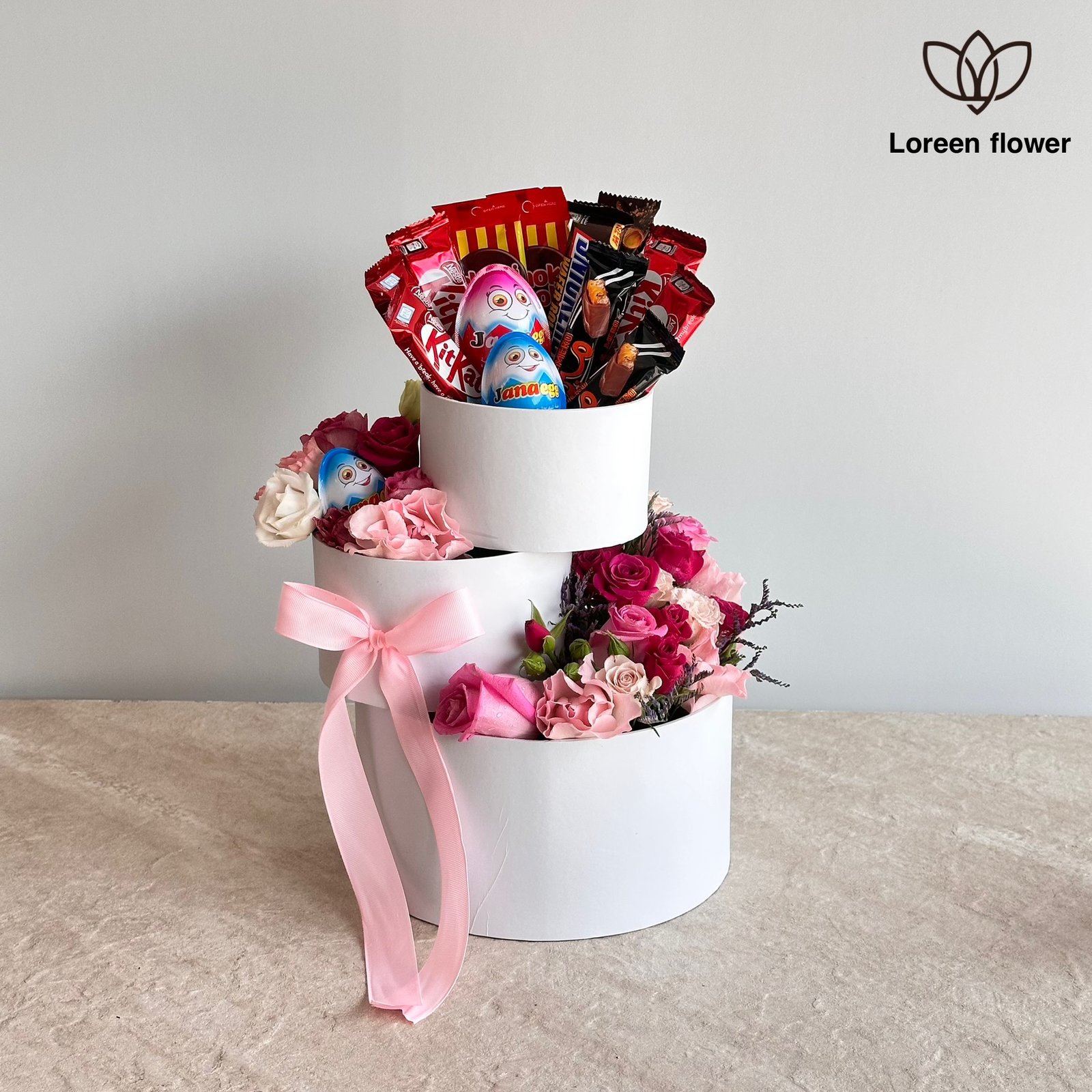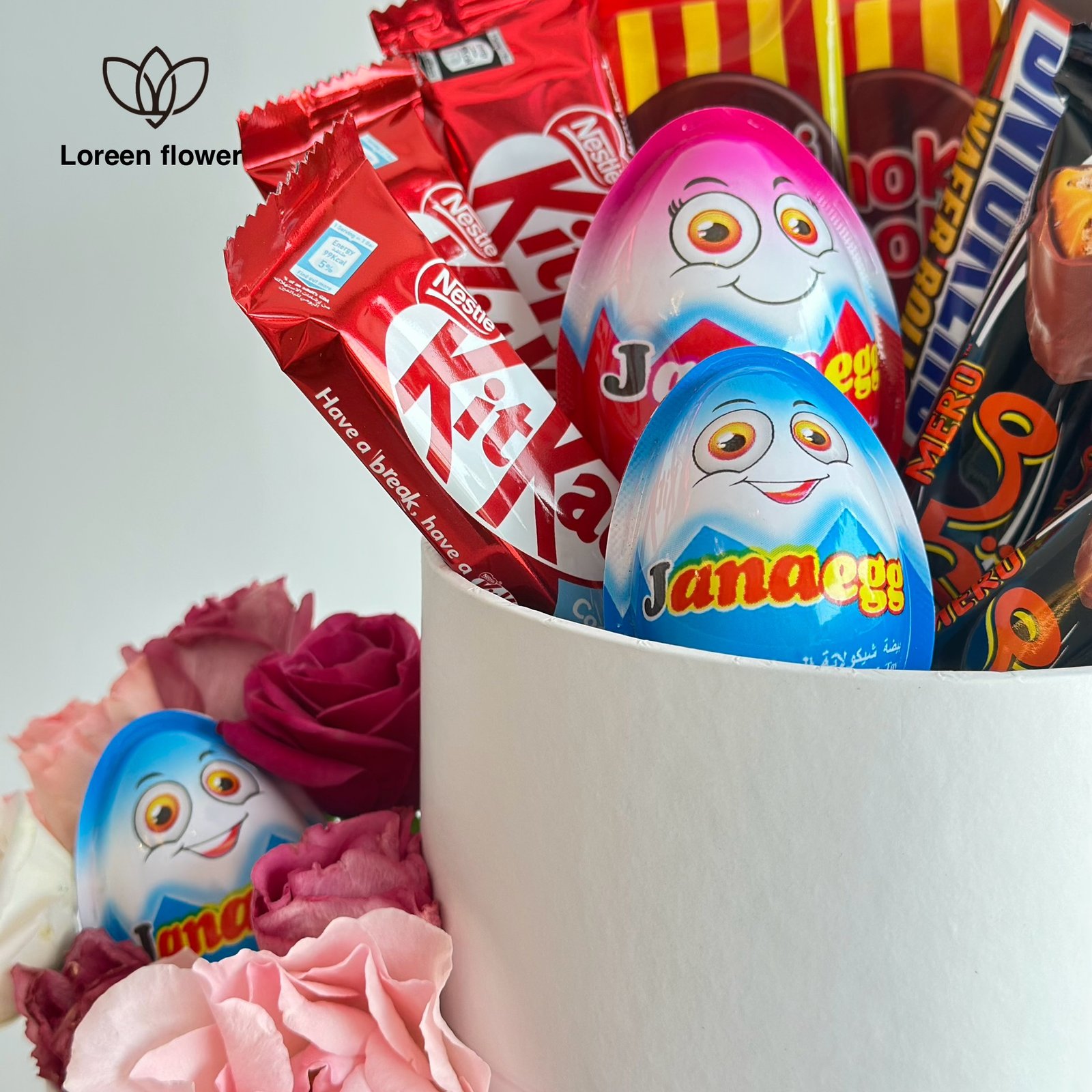 باقة الشوكولاتة والورد المتنوعة هي الهدية المثالية التي تجمع بين الشوكولاتة اللذيذة و الزهور الرائعة، وتخلق تجربة مميزة مليئة بالبهجة والسرور. تم ترتيب أصناف متنوعة من الشوكولاتة مثل كيندر، سنيكرز، و ديرتي كيك في صندوق مزدوج ذو تصميم أنيق، بينما الورود تضفي لمسة من الجمال والأنوثة. يتم تنسيق هذه الباقة مع رباط وردي أنيق، مما يجعلها خيارًا ممتازًا لتهنئة شخص مميز في المناسبات الخاصة