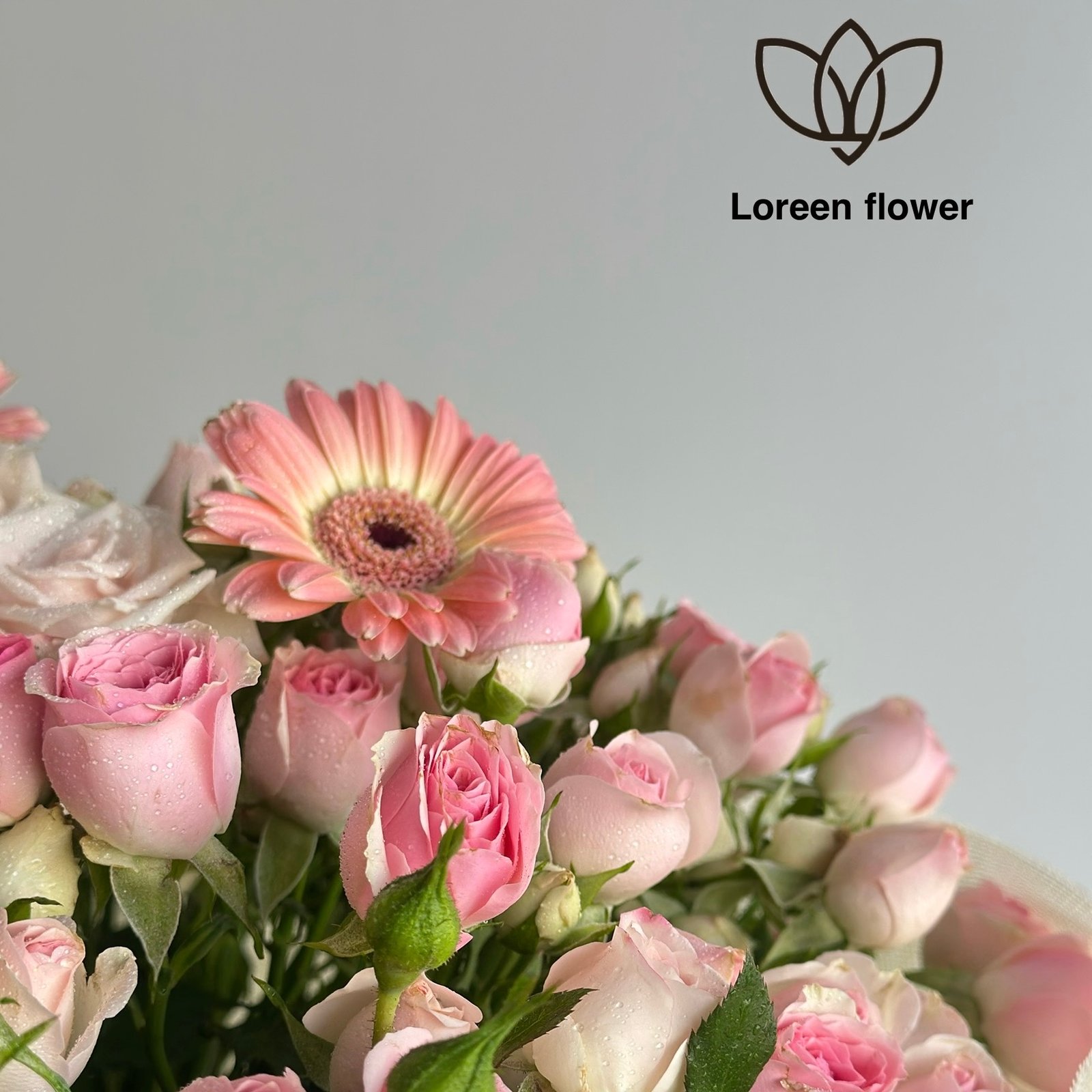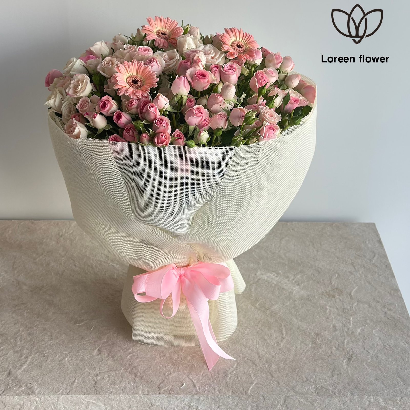 تتكون هذه الباقة الرائعة من 40 غصن من البيبي روز المتنوع الذي يضفي لمسة من الرقة والجمال، مزينة بـ 3 جلبيريا التي تعزز من رونق الورود بلمسة فريدة. تم تنسيق الزهور بعناية ضمن تغليف شبكي أبيض مع ربطها بشريط وردي أنيق، مما يضيف لمسة مميزة من الأناقة والبساطة.