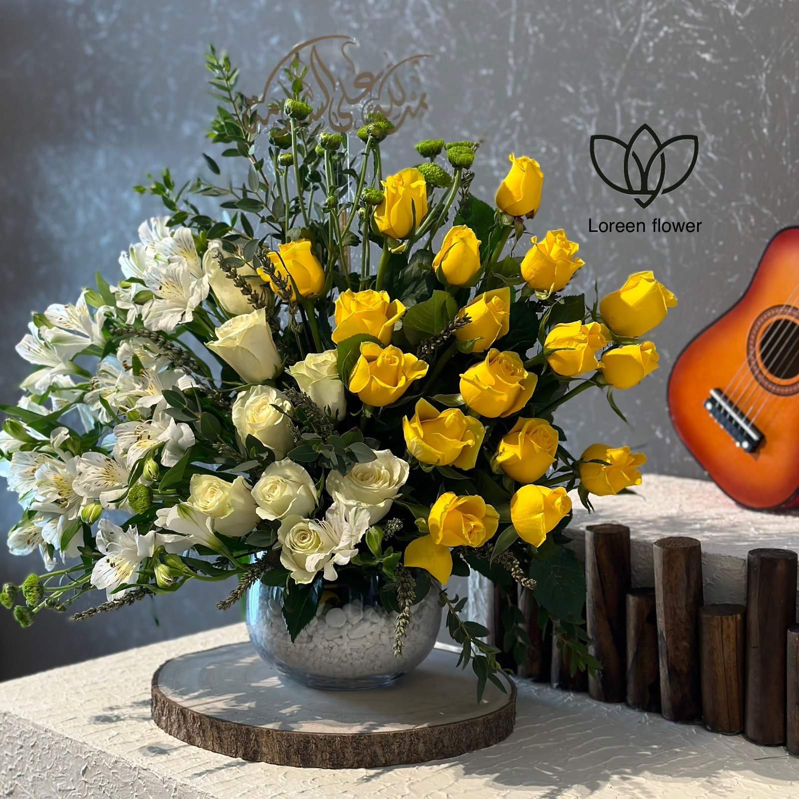تُعد هذه الباقة الخيار المثالي لتعبير عن الفرح والحب، حيث تتداخل الورود بألوانها المشرقة مع الأزهار البيضاء لتمنحك لحظة من البهجة والرقي