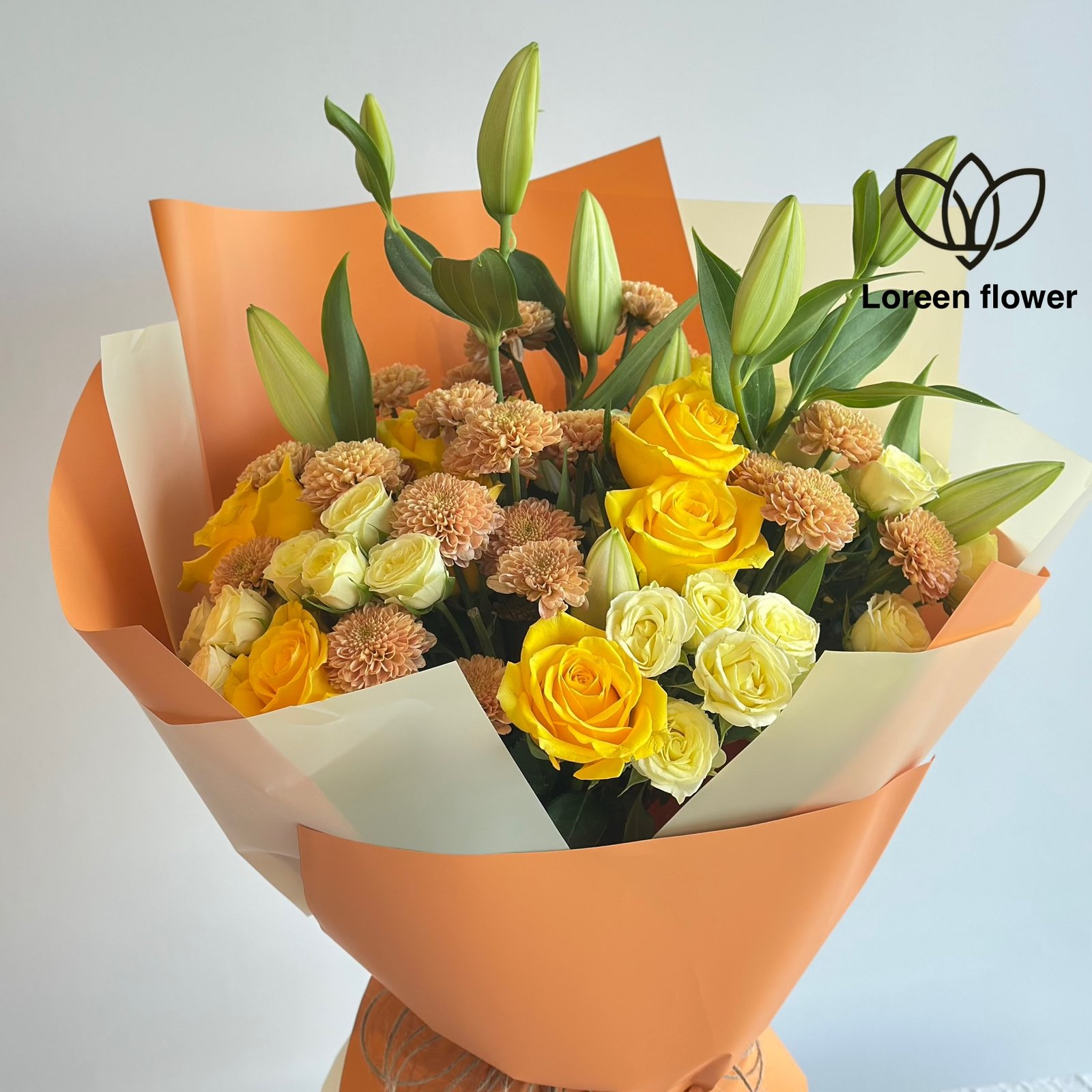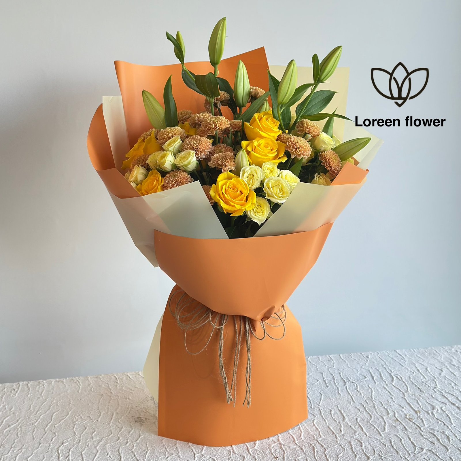 تتألف هذه الباقة من الأزهار المبهجة التي تضم 2 أغصان لليليوم، والتي تضيف لمسة من الأناقة والرقي. كما تحتوي الباقة على 7 وردات جوري صفراء، التي تمثل التفاؤل والإشراق. إلى جانبها، نجد 7 أغصان من البيبي روز الناعمة، التي تعزز من جمال التنسيق وتضفي لمسة من الرقة. وتزين الباقة أيضًا 2 كريز، مما يضيف لمسة من الألوان الدافئة والمبهجة.
