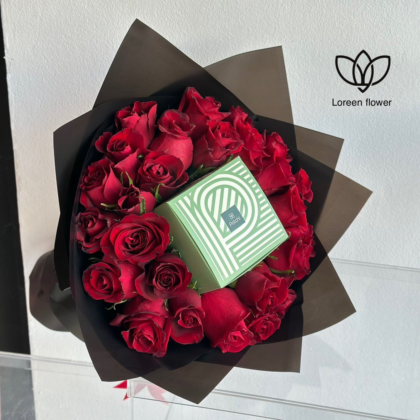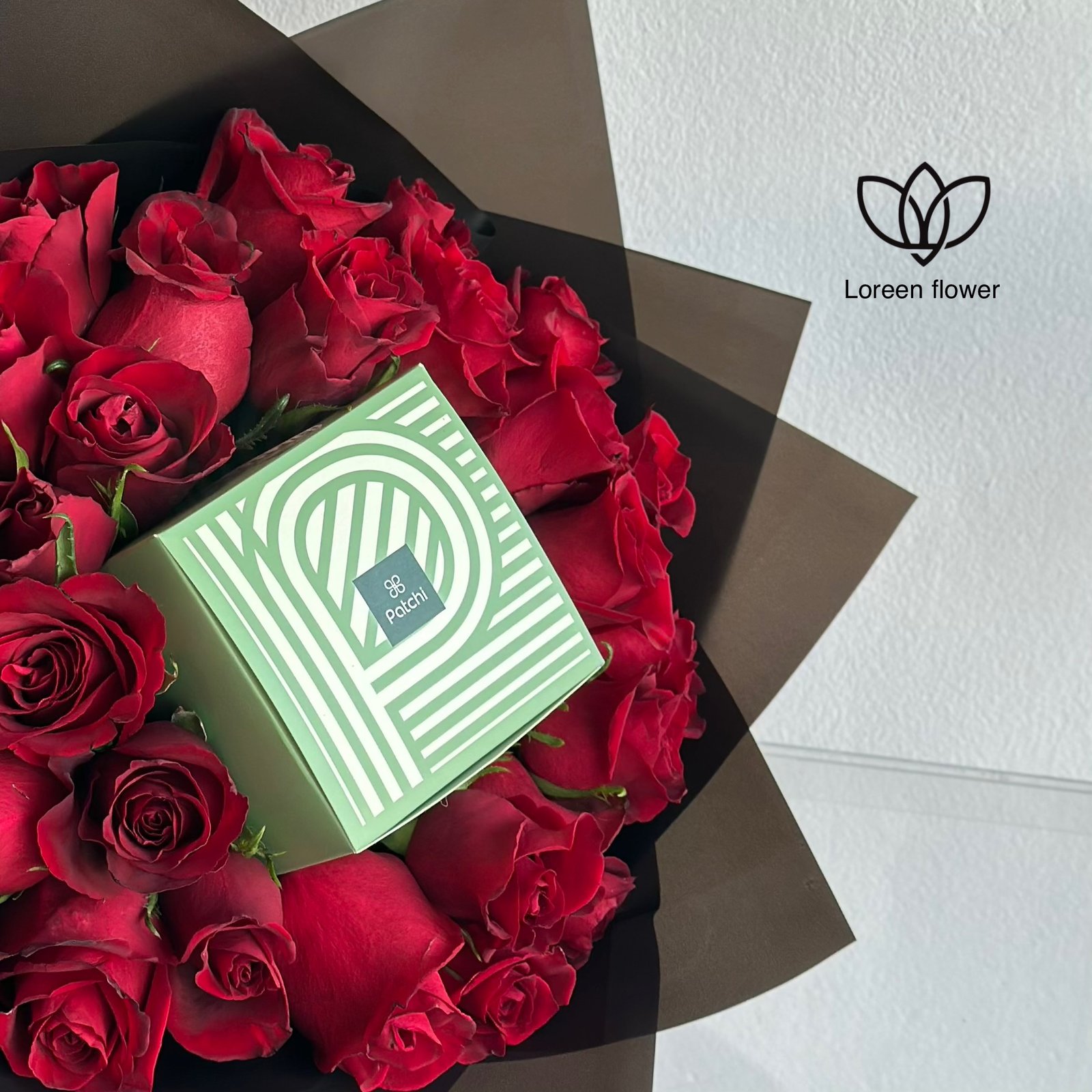 تتكون هذه الباقة من أربعين وردة حمراء جميلة، تعكس ألوانها العميقة والراقية مشاعر الحب والجمال. تم تنسيق الزهور بطريقة متقنة لتشبع الحواس بالجمال والفخامة. وسط هذه الورود الرائعة، تتوسط عبوة من باتشي تزن ربع كيلو، لتضيف لمسة من الحلاوة والذوق الرفيع.