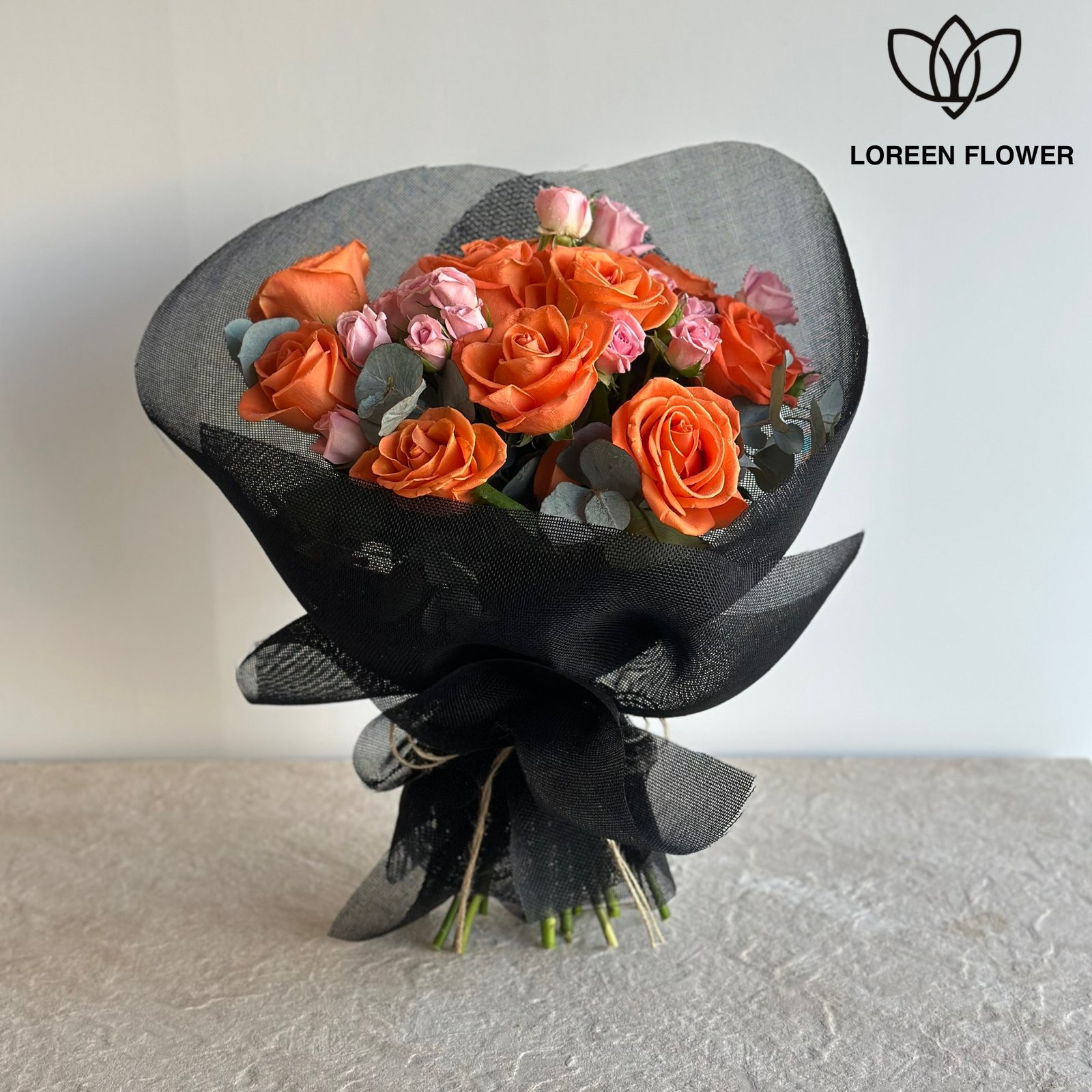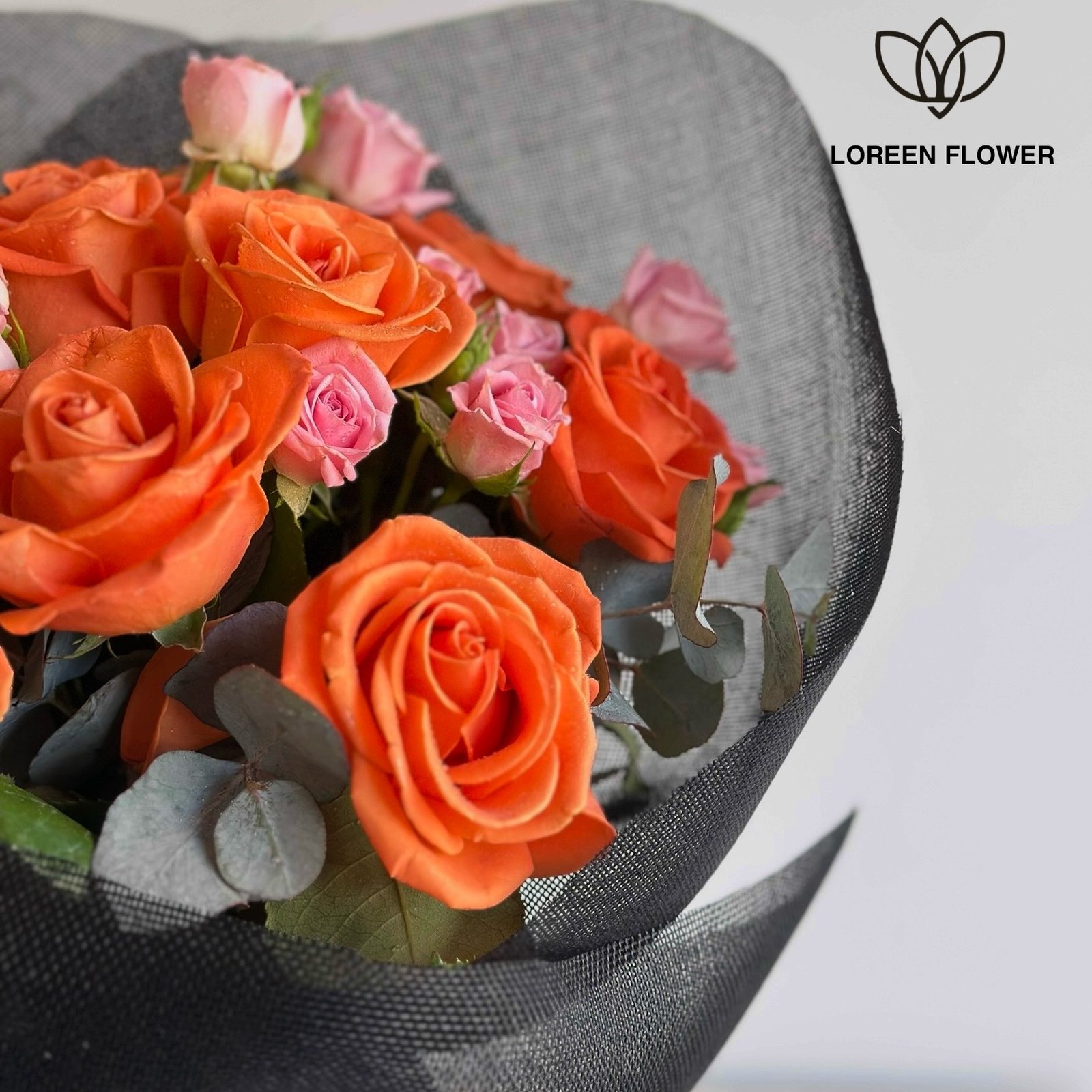 تعد “باقة ورد لحضات الشروق ” الخيار المثالي لجميع مناسباتك الخاصة وللحظاتك السعيدة. سواء كانت لمناسبات عيد الميلاد، أو ذكرى الزواج، أو احتفال بترقية، أو مجرد لحظة تستحق الاحتفال، فإن هذه الباقة المميزة ستكون الخيار الأنسب. تجمع هذه الباقة الرائعة بين ٤ أغصان من بيبي روز الجميلة ذات اللون الوردي الفاتح، و ١٠ أغصان من الورد الجوري البرتقالي الفاتح المشرق، مع ٣ أغصان من الكليبتوس الأخضر، الذي يضيف لمسة من الحيوية والطبيعة إلى الباقة. هذه الأزهار المميزة تم تنسيقها بعناية لتعكس مشاعر الحب والفرح، ولتُعبّر عن أروع اللحظات التي تستحق الاحتفال. تم تغليفها بشكل عصري وأنيق، مع لمسة من اللون الأسود الجذاب، مما يضفي عليها لمسة من الفخامة التي تجعلها مثالية لكل مناسبة