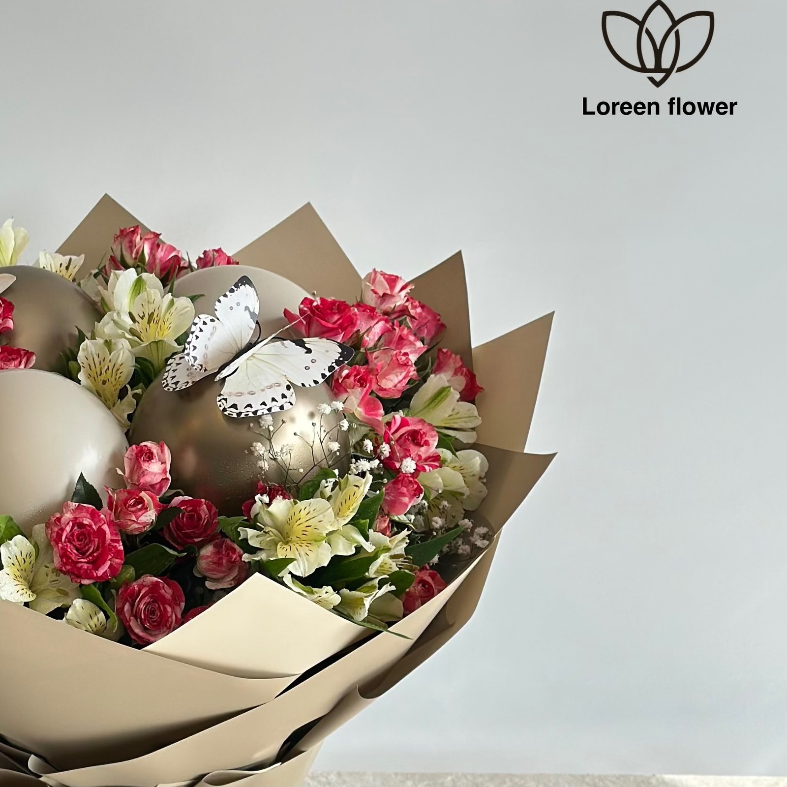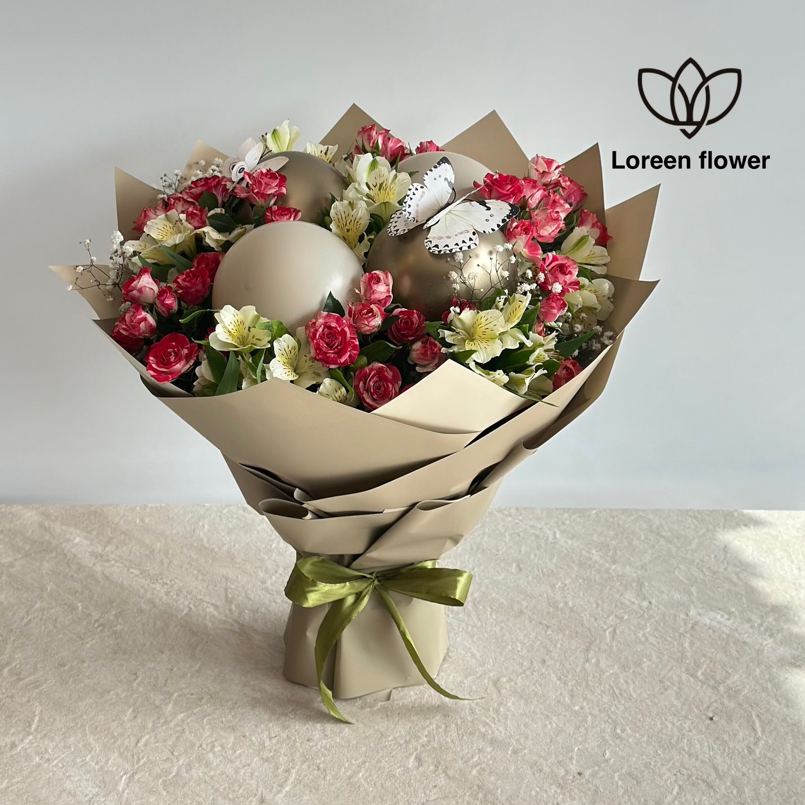 تتميز هذه الباقة بتنسيق رائع يجمع بين 10 غصون من البيبي روز الجميلة و10 وردات جوري حمراء، مما يضفي عليها لمسة من الحب والرقة. كما تحتوي على 5 أغصان من الاستوميرا التي تضيف بهجة ونضارة، بالإضافة إلى بالونات ذهبية وبيج فامق تضفي لمسة من الفخامة والتميز. الفراشات البيضاء تزين الباقة، مما يعزز من سحرها ويجعلها مناسبة تمامًا للمناسبات الاحتفالية.