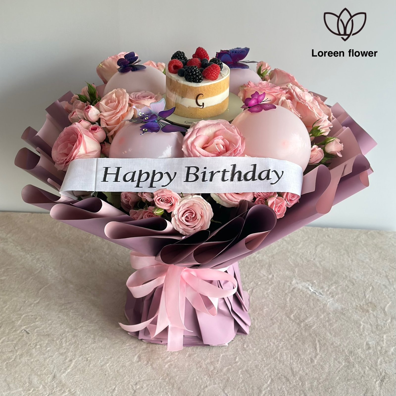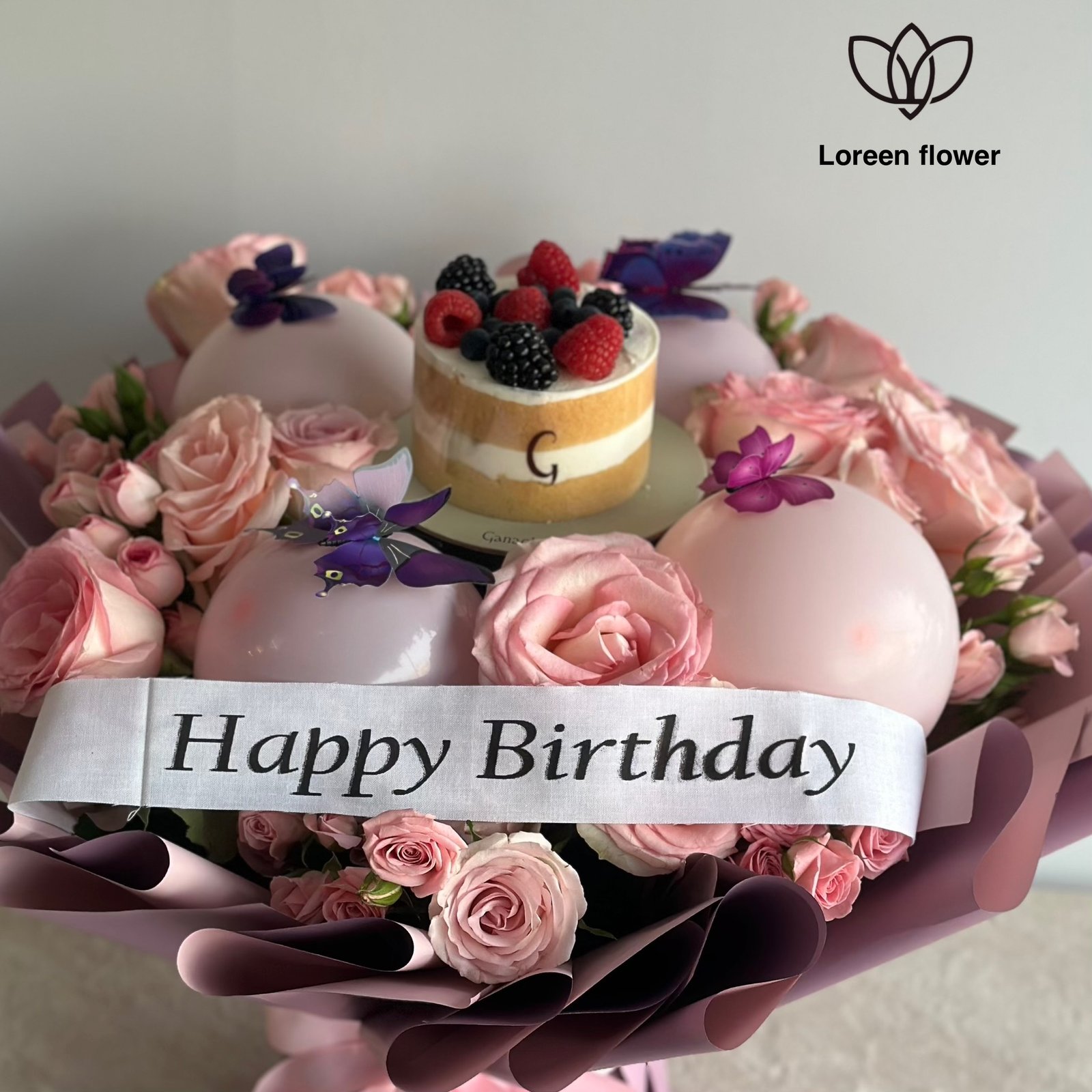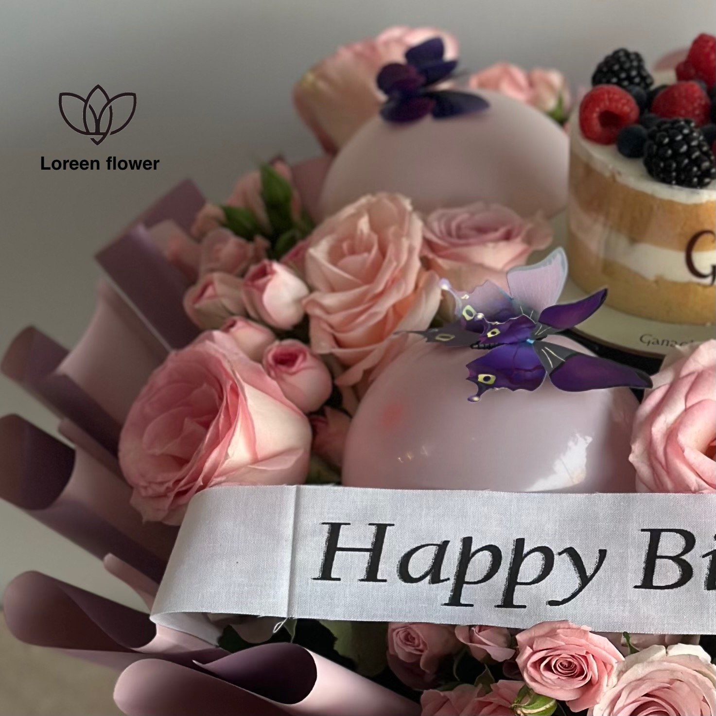 الكيكة الصغيرة لشخصين تقدم لمسة دافئة، بينما الباقة التي يبلغ قطرها نصف متر تضفي جواً من الفخامة والبهجة. تجمع هذه الباقة بين الفرح والأنوثة في تنسيق راقٍ، حيث تعكس الأناقة والاحتفال.