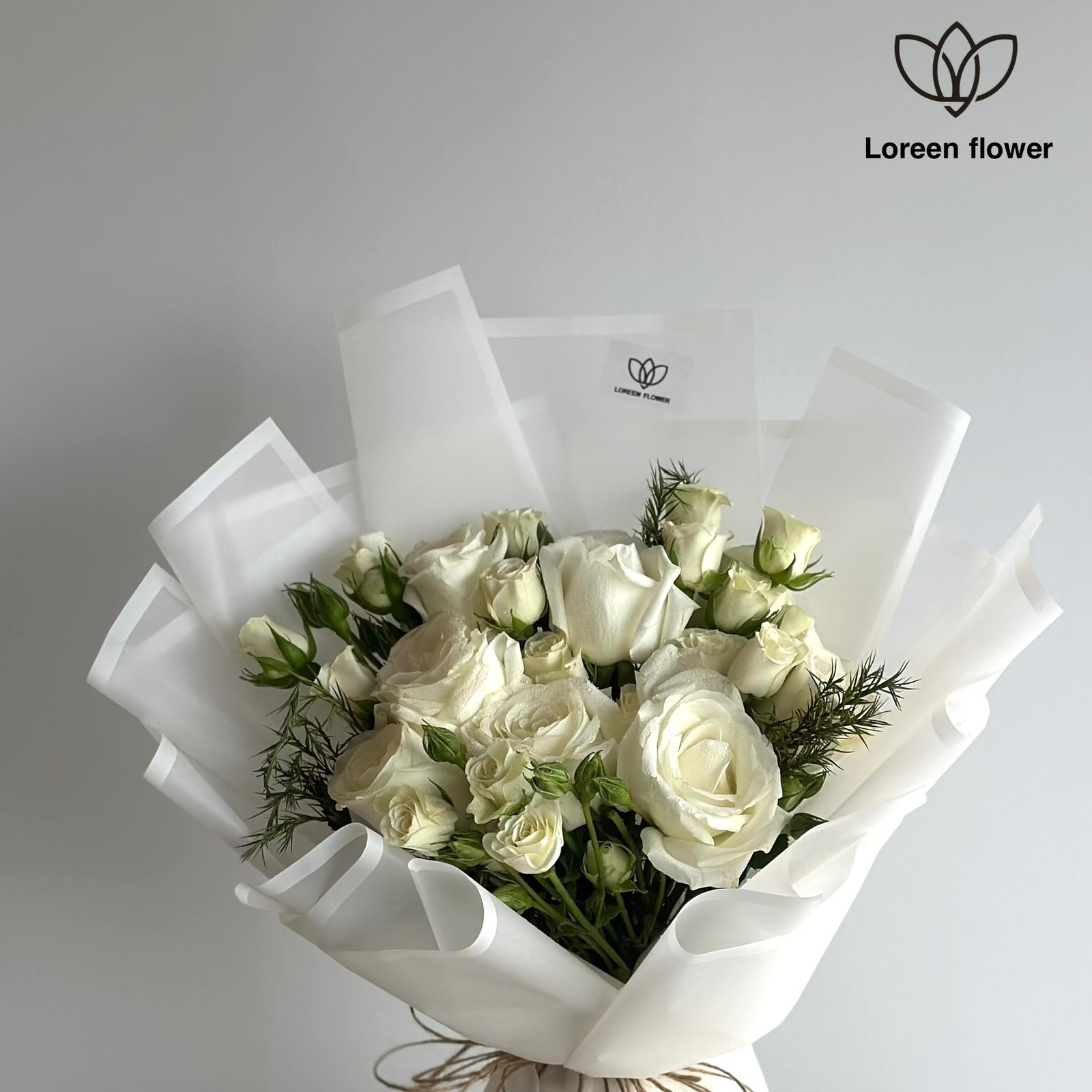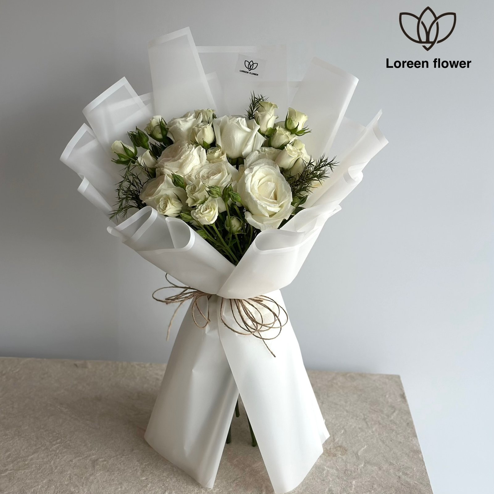 تتكون هذه الباقة من 4 أغصان من البيبي روز البيضاء، التي تمنحها لمسة من الرقة والنعومة، بالإضافة إلى 8 وردات جوري بيضاء مذهلة، تبرز جمال الزهور وتضفي لمحة من الفخامة والهدوء. وتأتي هذه الورود مزينة بـ 2 أغصان من المنيوم، مما يضيف مظهرًا عصريًا وأنيقًا إلى الباقة.