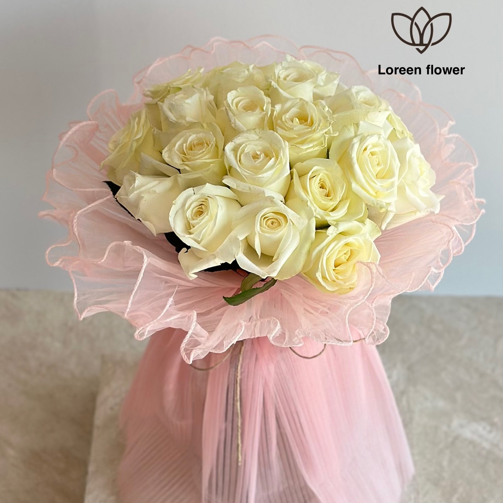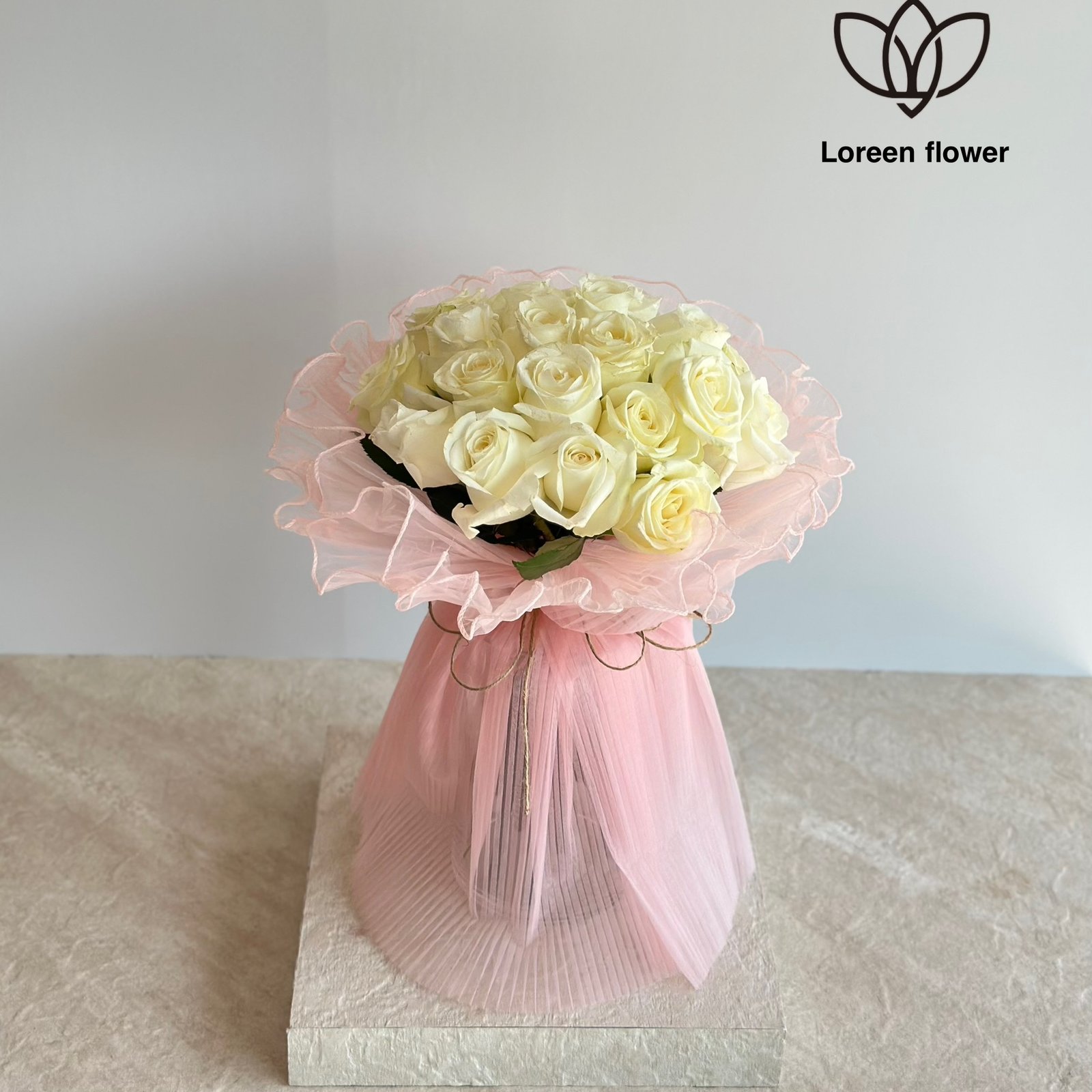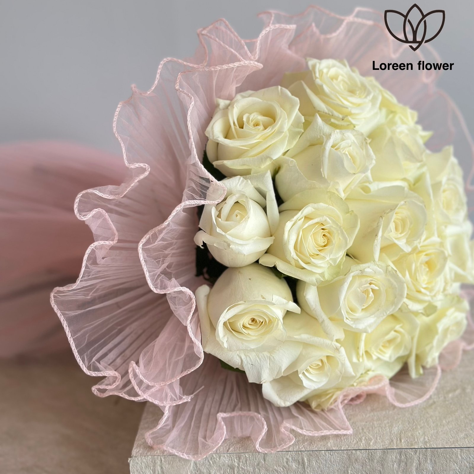 تتألف هذه الباقة الجميلة من 25 وردة جوري أبيض لطيف، يتميز جمالها