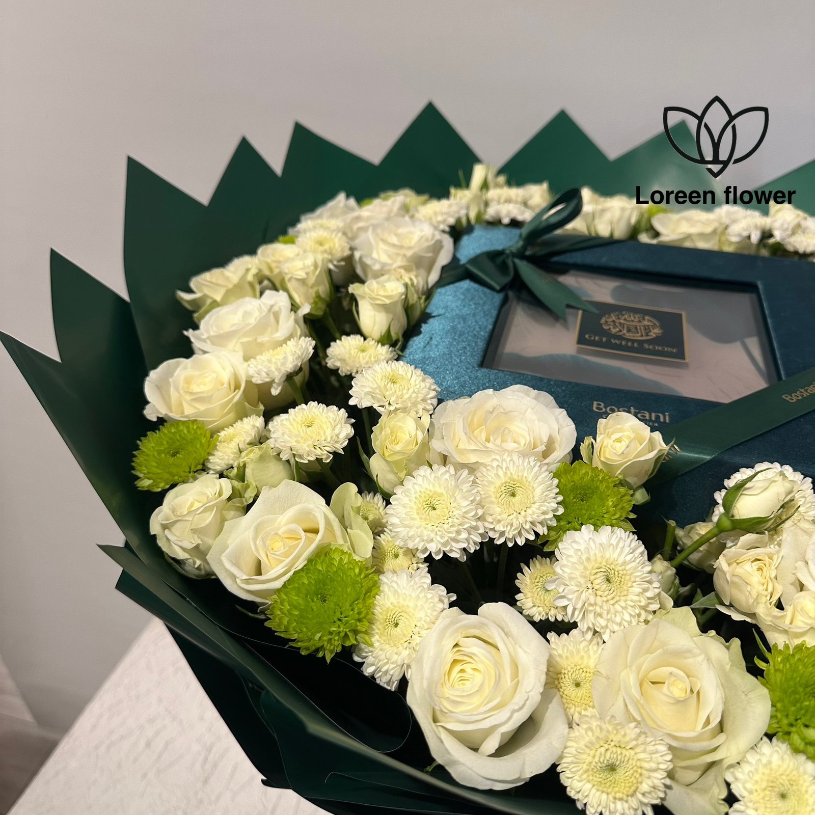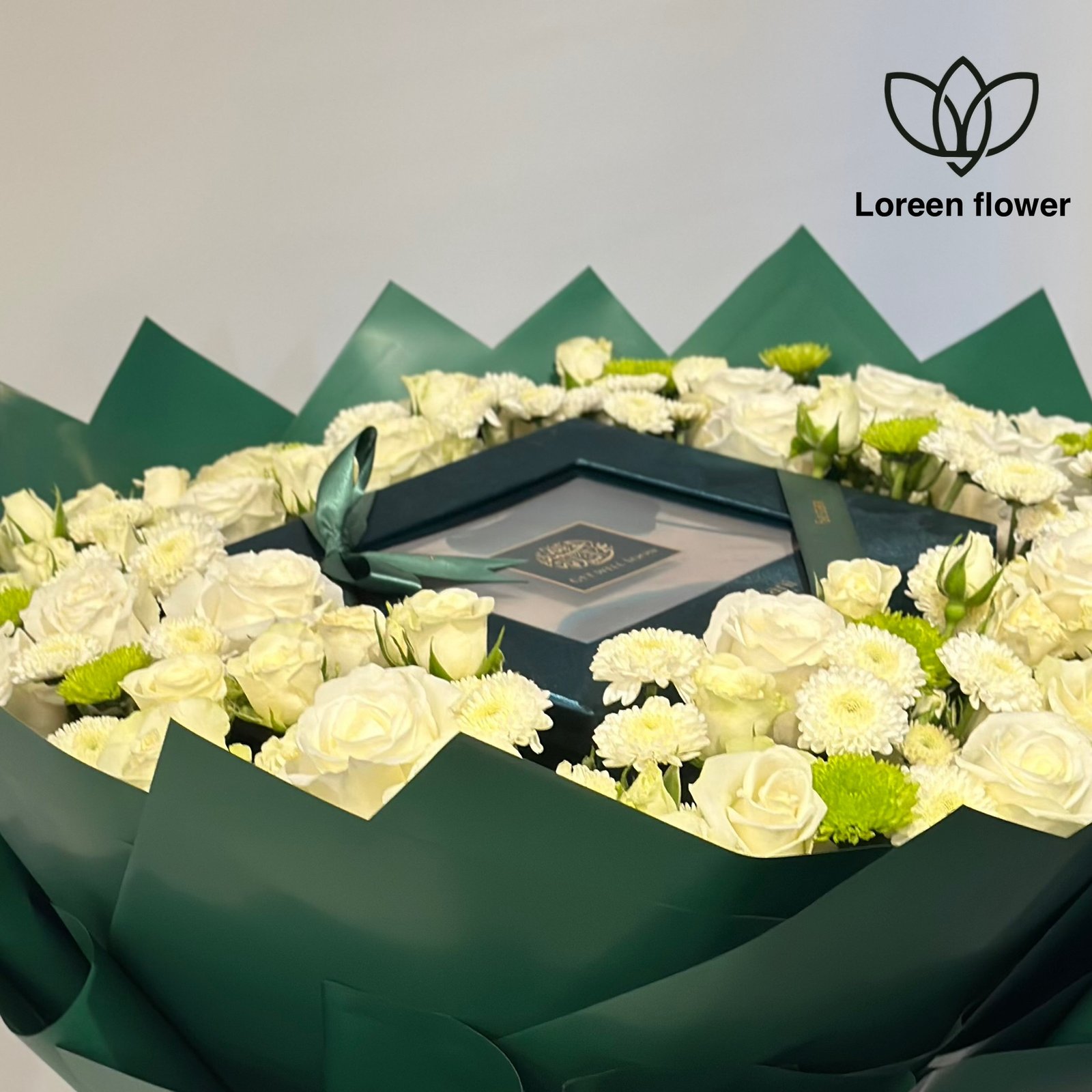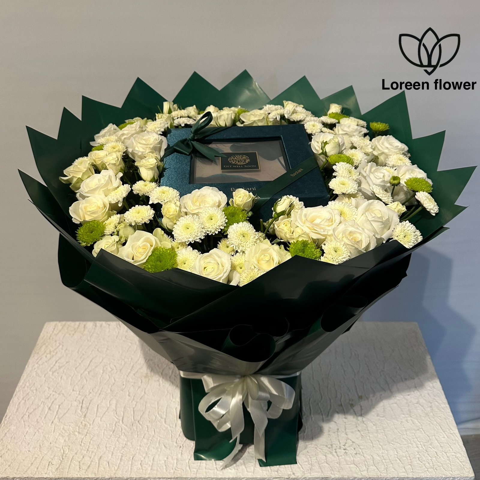 تتميز هذه الباقة الفاخرة التي يبلغ قطرها 75 سم بتشكيلة متنوعة من الأزهار البيضاء النقية، التي تضم ورود الجوري البيضاء والزهور الصغيرة بألوان متناسقة. وسط هذه الزهور الرائعة، تجد شوكولاتة “الحمد لله على السلامة” من بستاني، مما يضيف لمسة من الفخامة إلى الهدية. الباقة مغلفة بورق أخضر أنيق، مع شريط أبيض يربط الأسفل، مما يجعلها مناسبة تماماً للتهنئة بالمناسبات الخاصة.