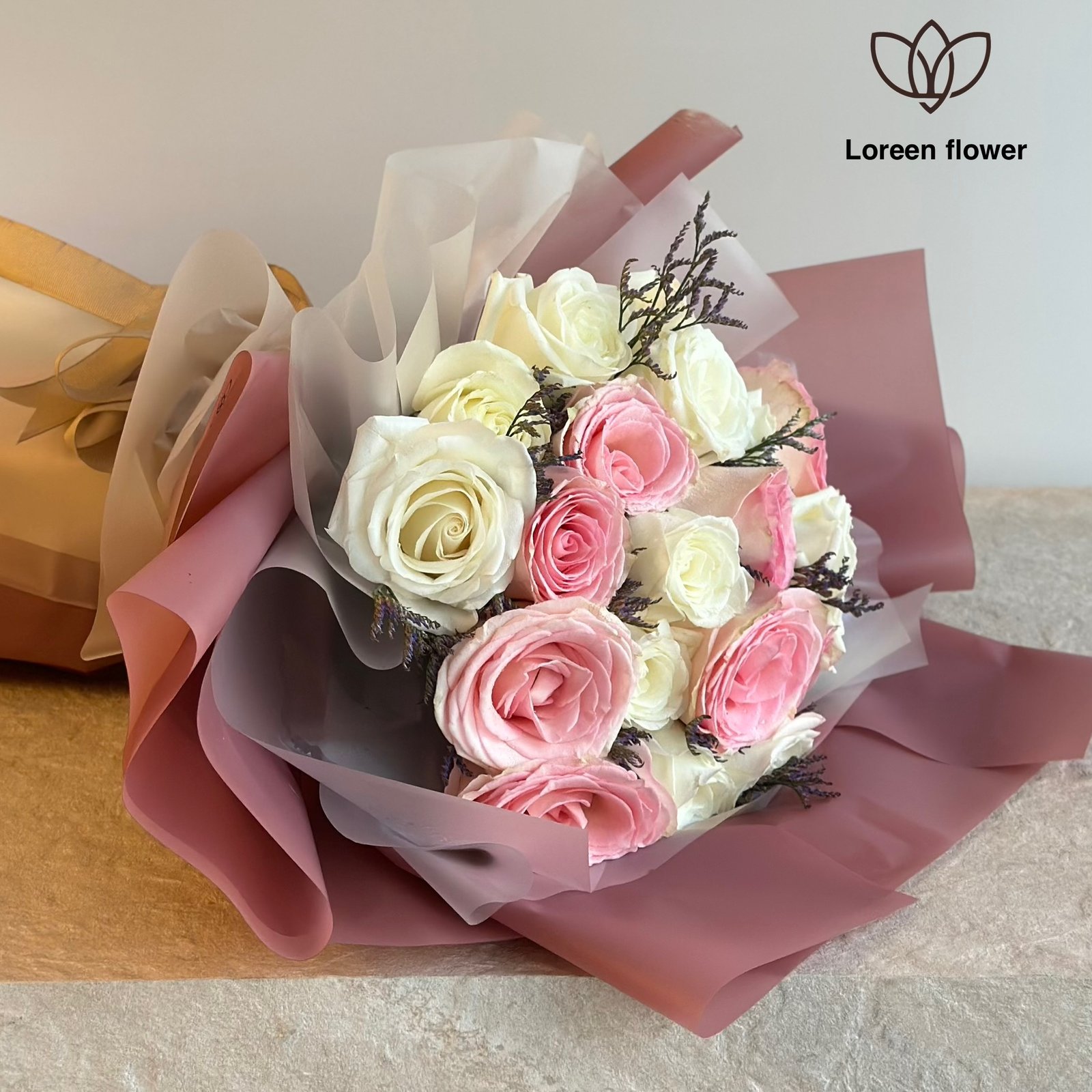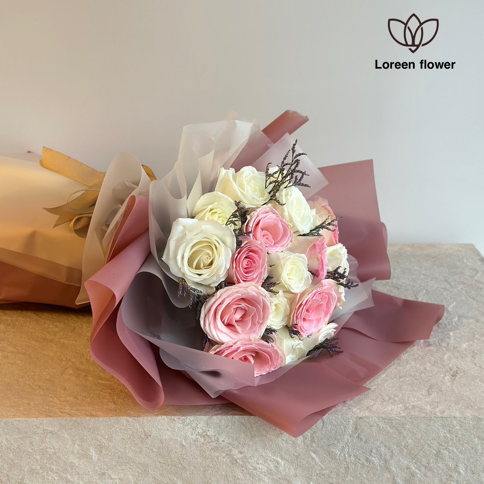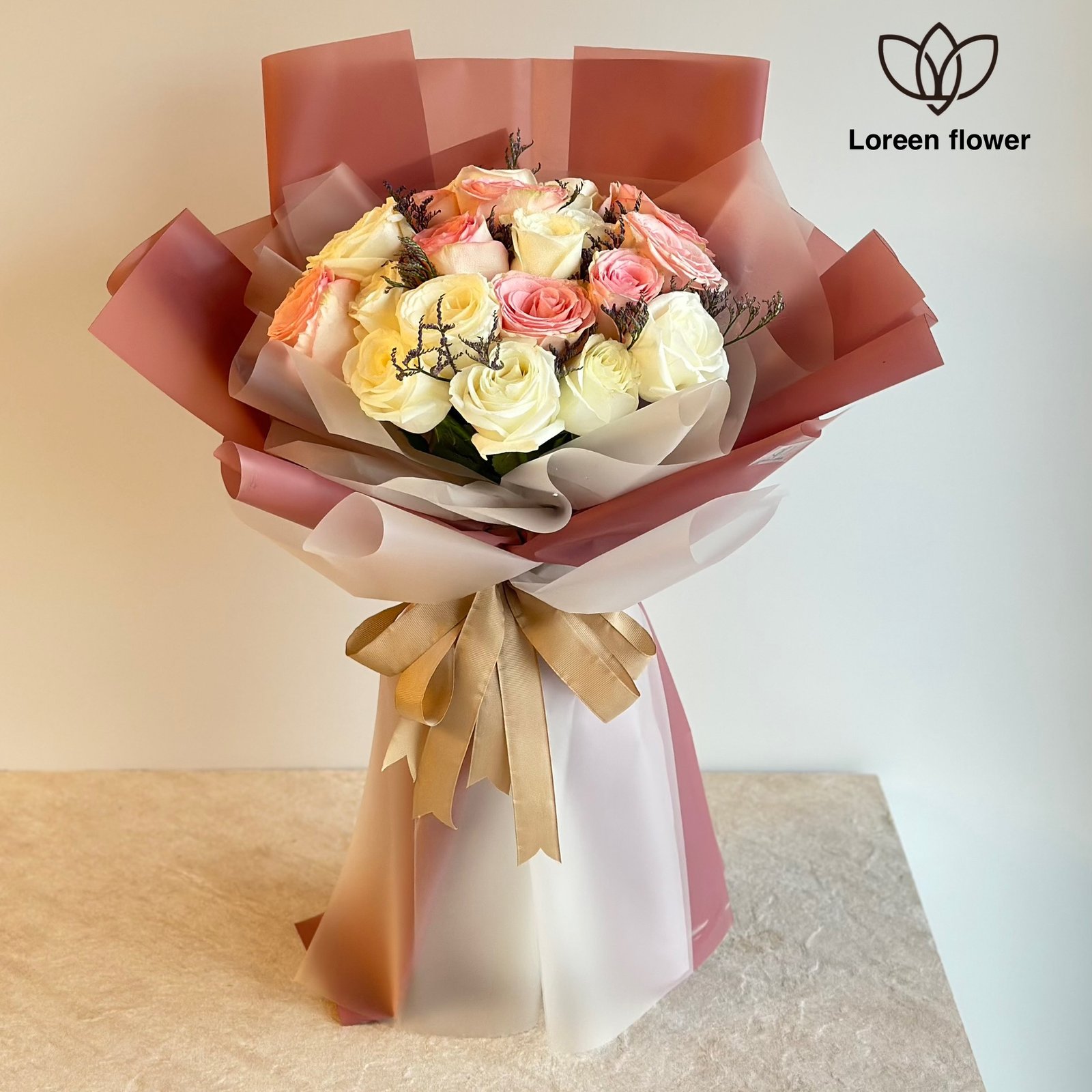تتألف هذه الباقة الجميلة من 19 وردة جوري متنوع، حيث تجمع بين الألوان الفاتحة والناعمة مثل الوردي الفاتح والأصفر الكريم، مما يضفي جمالًا مميزًا. الأزهار تم تنسيقها بعناية في ورق شفاف بلونين متدرجين، مع ربط الباقة بشريط ساتان ذهبي، مما يضيف لمسة من الأناقة والنعومة لهذه الباقة المفعمة بالحب والجمال.