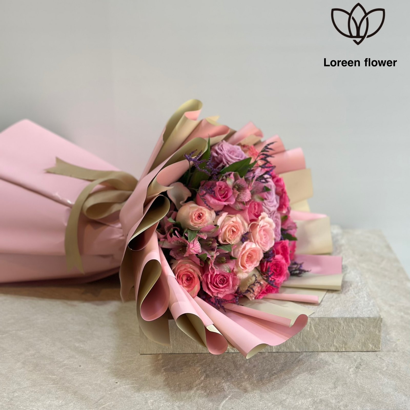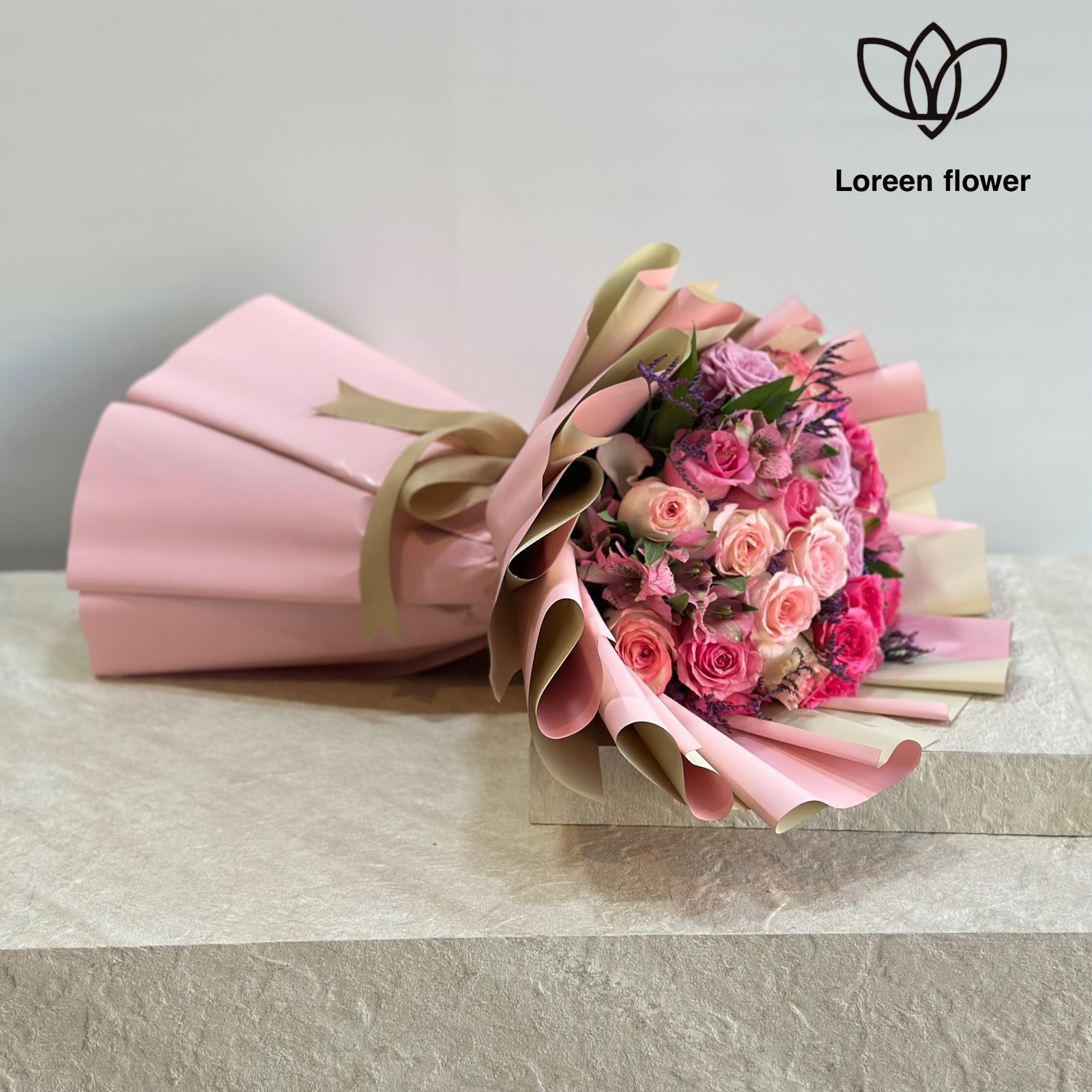 تتكون هذه الباقة الرائعة من 25 غصنًا من البيبي روز المتنوعة التي تجمع بين درجات الوردي الفاتح والغامق، مما يضفي تناغمًا رائعًا بين الألوان. الورود الصغيرة تُضفي لمسة من الرقة والجمال، في تنسيق مليء بالأنوثة والهدوء. تم تزيين الباقة بتفاصيل إضافية من الورق الوردي الفاتح والبيج، مما يبرز جمال الأزهار بشكل أنيق، ويكمل المظهر العصري.