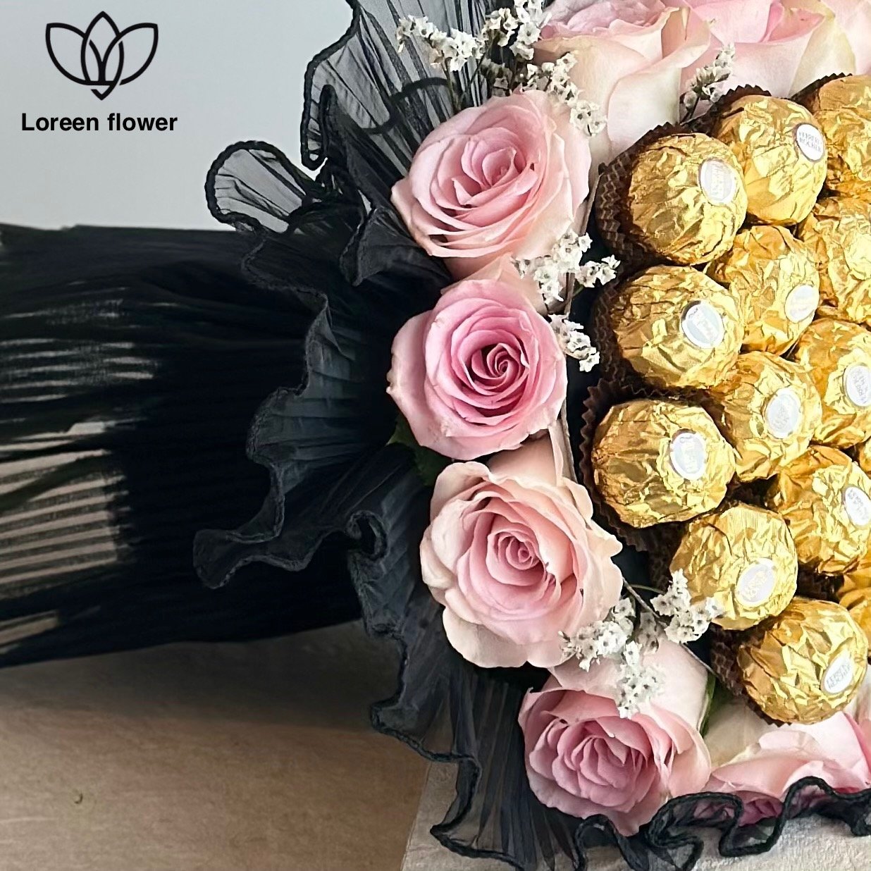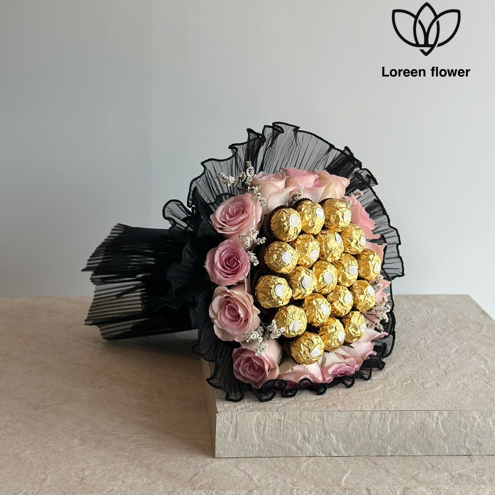 تتألف هذه الباقة المميزة من 18 وردة جوري رائعة بألوانها الوردية الناعمة، التي تضفي لمسة من الرقة والجمال. تم تنسيق الورود بعناية داخل شبكة سوداء رقيقة تبرز جمالها، في تناغم تام مع 19 قطعة من شوكولاتة فيريرو روشيه الذهبية، مما يضيف لمسة من الفخامة والذوق الرفيع. الزهور والشوكولاتة تلتقي معًا لتعكس معنى الاحتفال والمحبة في أبهى صورها.