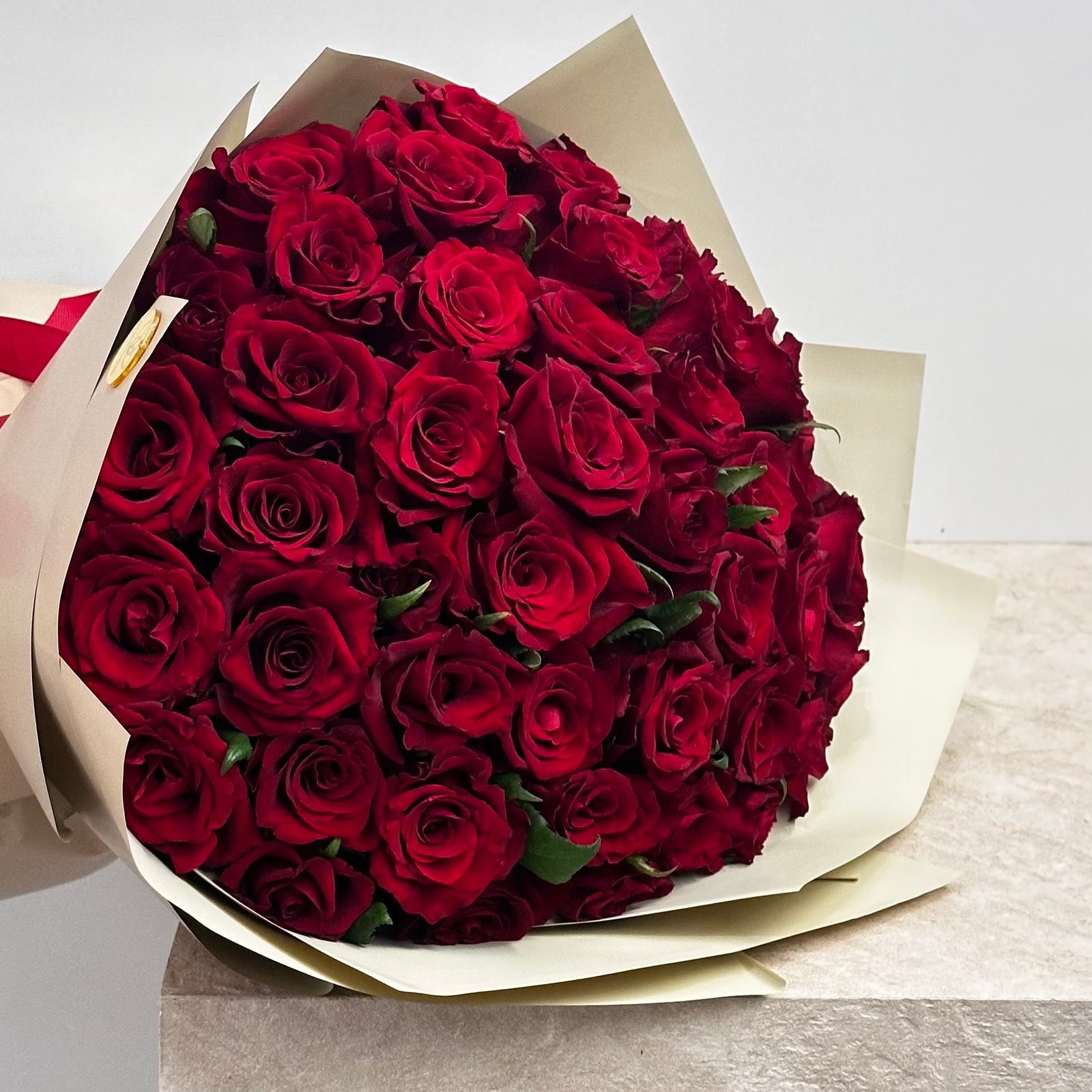 باقة تتكوّن من خمسين وردة حمراء فاخرة تعبّر عن الحب والشغف بأبهى صورة. هذه باقة ورد حمراء مثالية كباقة ورد للحب، تجمع بين جمال الورد وروعة التنسيق. تضم باقة ورد أو أزهار الورود المختارة بعناية، حيث تتألّق كل وردة حمراء داخل باقة ورد حمراء بتغليف بيج أنيق يمنح الباقة لمسة كلاسيكية راقية وجاذبية فاخرة