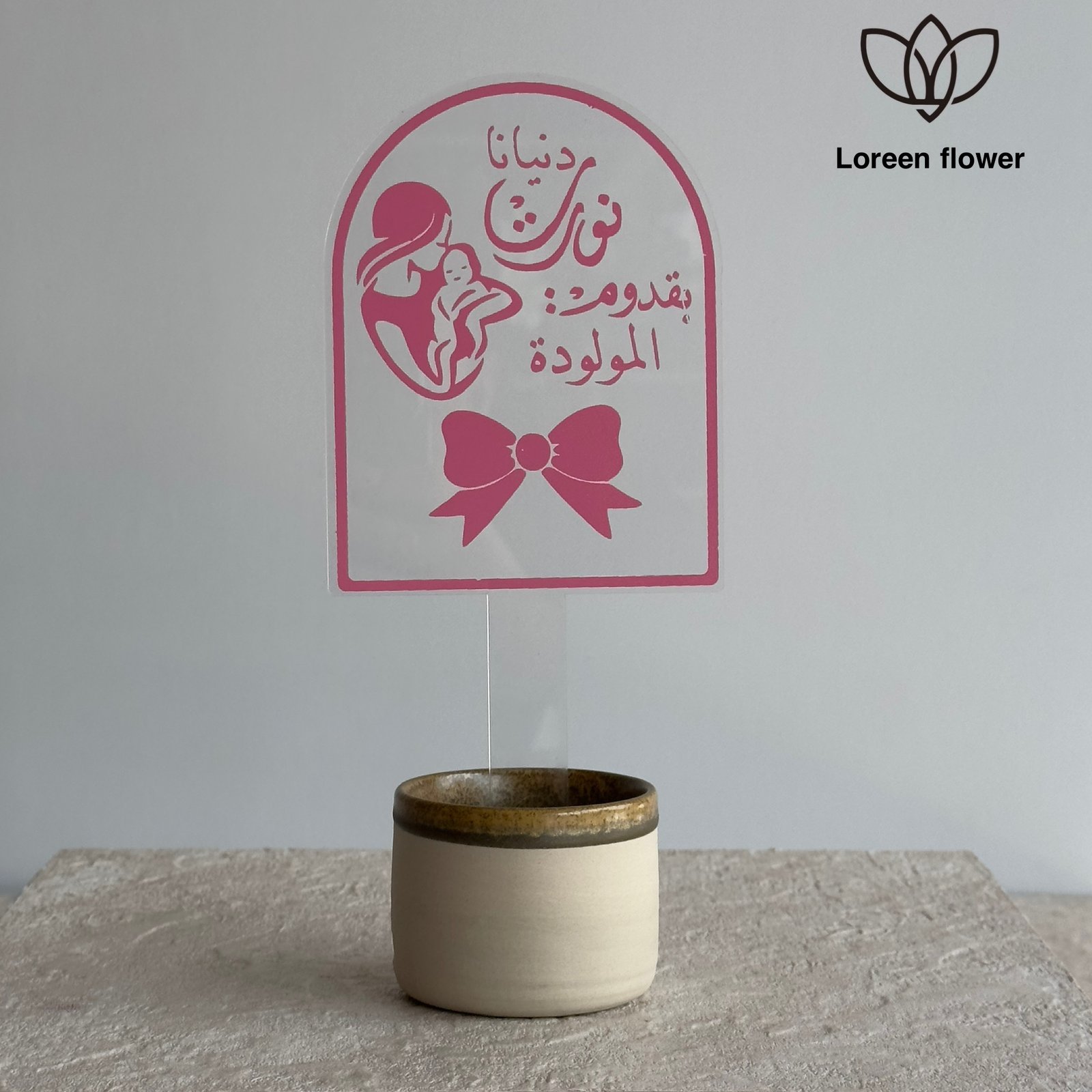 تغريسة شفافة أنيقة باللون الفوشيا، تحمل عبارة “دنيانا نورت بمولودنا” مع رسمة لأم تحمل طفلها، إضافة إلى شريط مزخرف أسفل التصميم. تعكس هذه التغريسة الفرحة بمناسبة قدوم المولود الجديد وتُضيف لمسة احتفالية لأي باقة زهور أو هدية تهنئة.