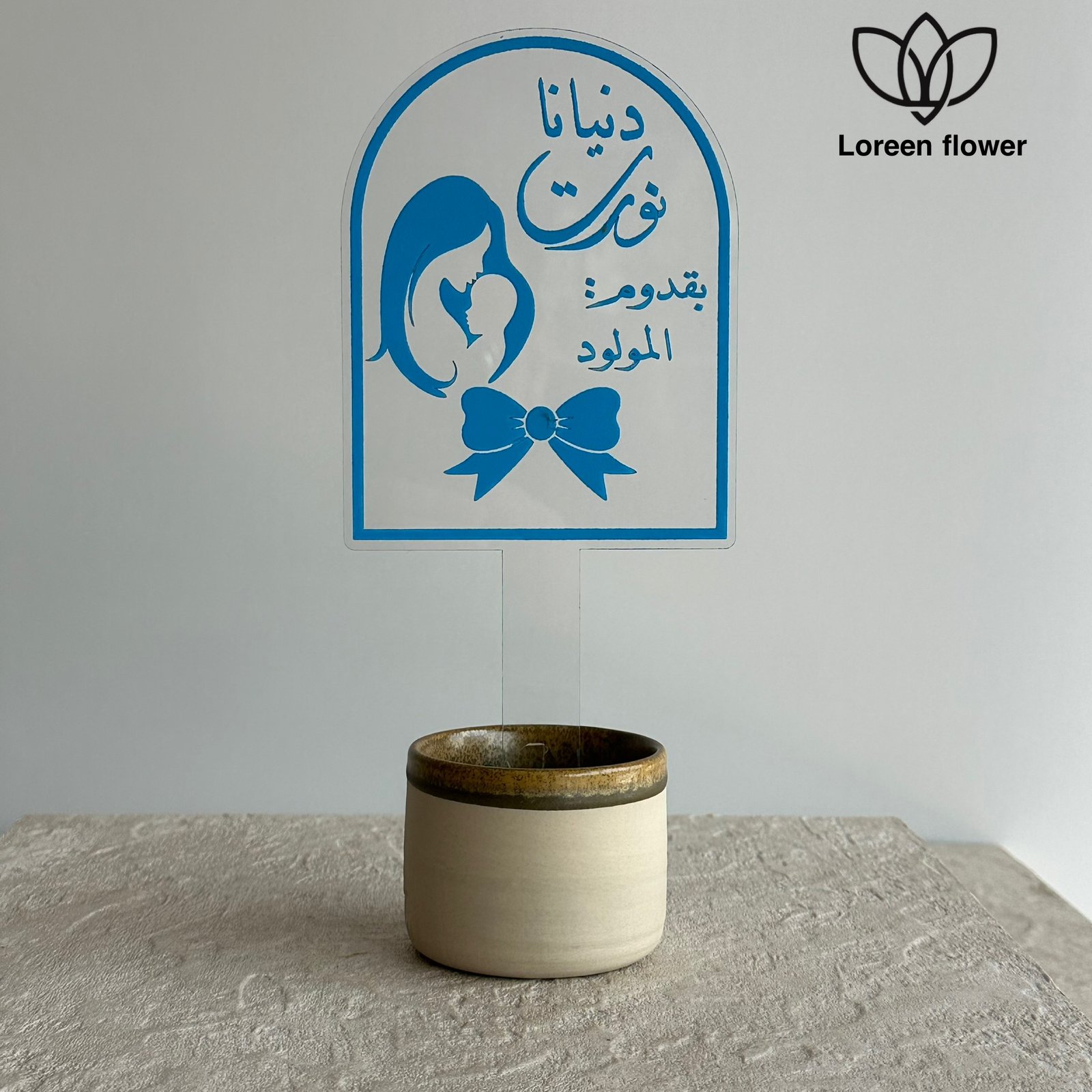 تغريسة شفافة أنيقة تحمل عبارة “منزل مبارك” مع رسمة لبيت ومفتاح، مما يعكس الفرحة بمناسبة الانتقال إلى منزل جديد. هذه التغريسة تضيف لمسة مميزة واحتفالية لأي باقة زهور أو هدية تهنئة.